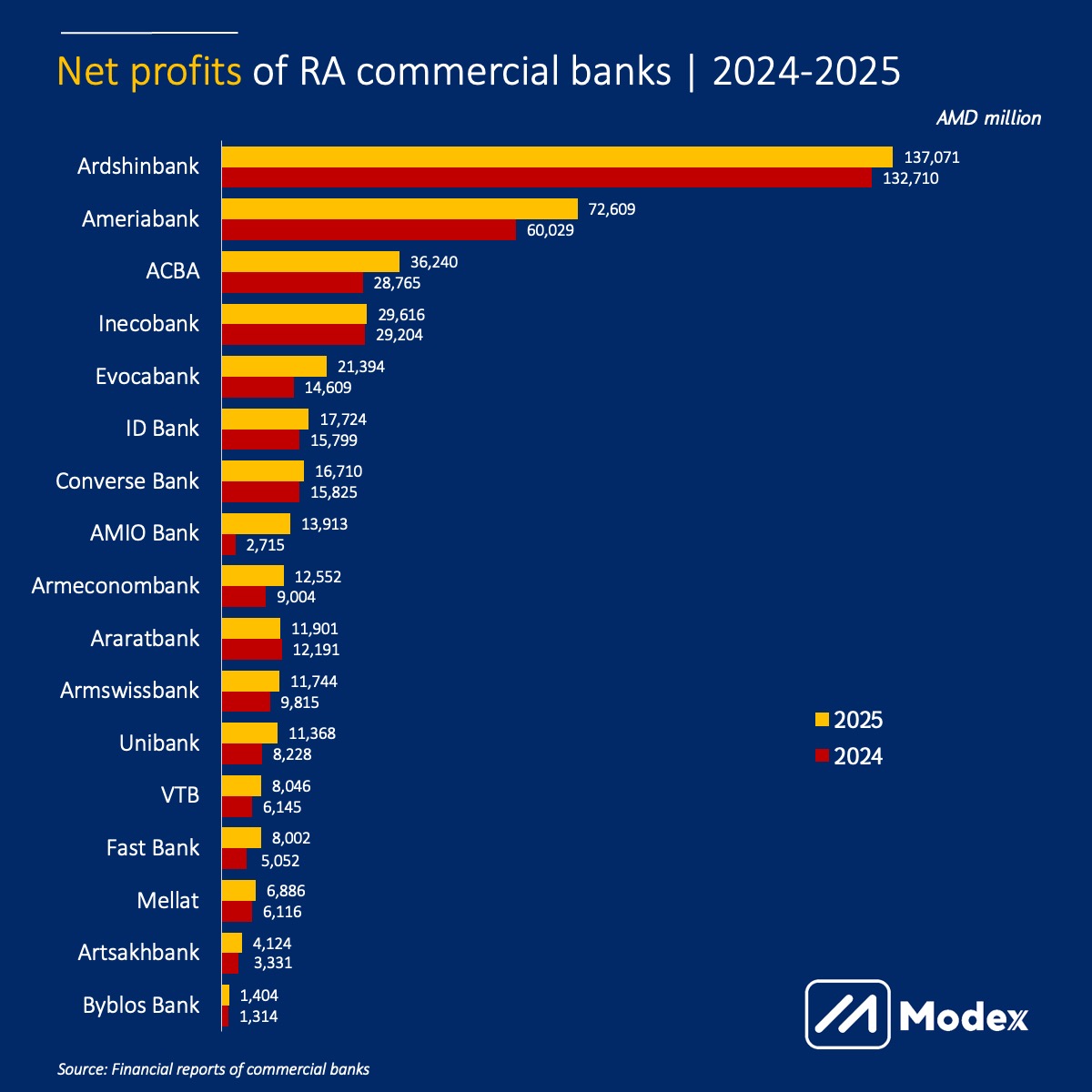 Ամենամեծ շահույթը արձանագրել է Ameriabank-ը՝ 7.5 մլրդ դրամ: