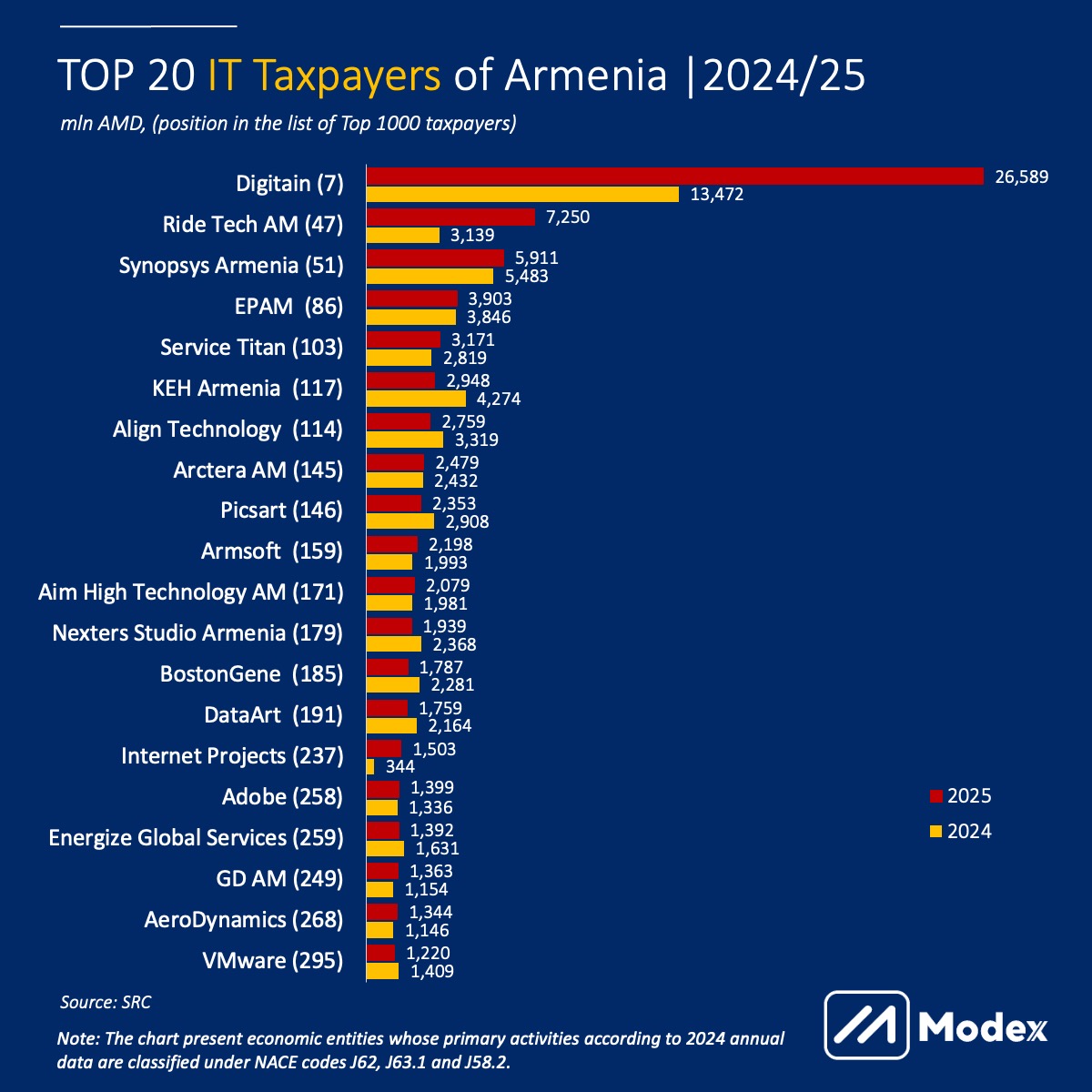In 2025, 69 IT companies were among the 1000 largest taxpayers, contributing a total of AMD 105.8 billion to the state budget. This marks an increase of AMD 21 billion compared to the contributions of IT companies among the 1,000 largest taxpayers in 2024.